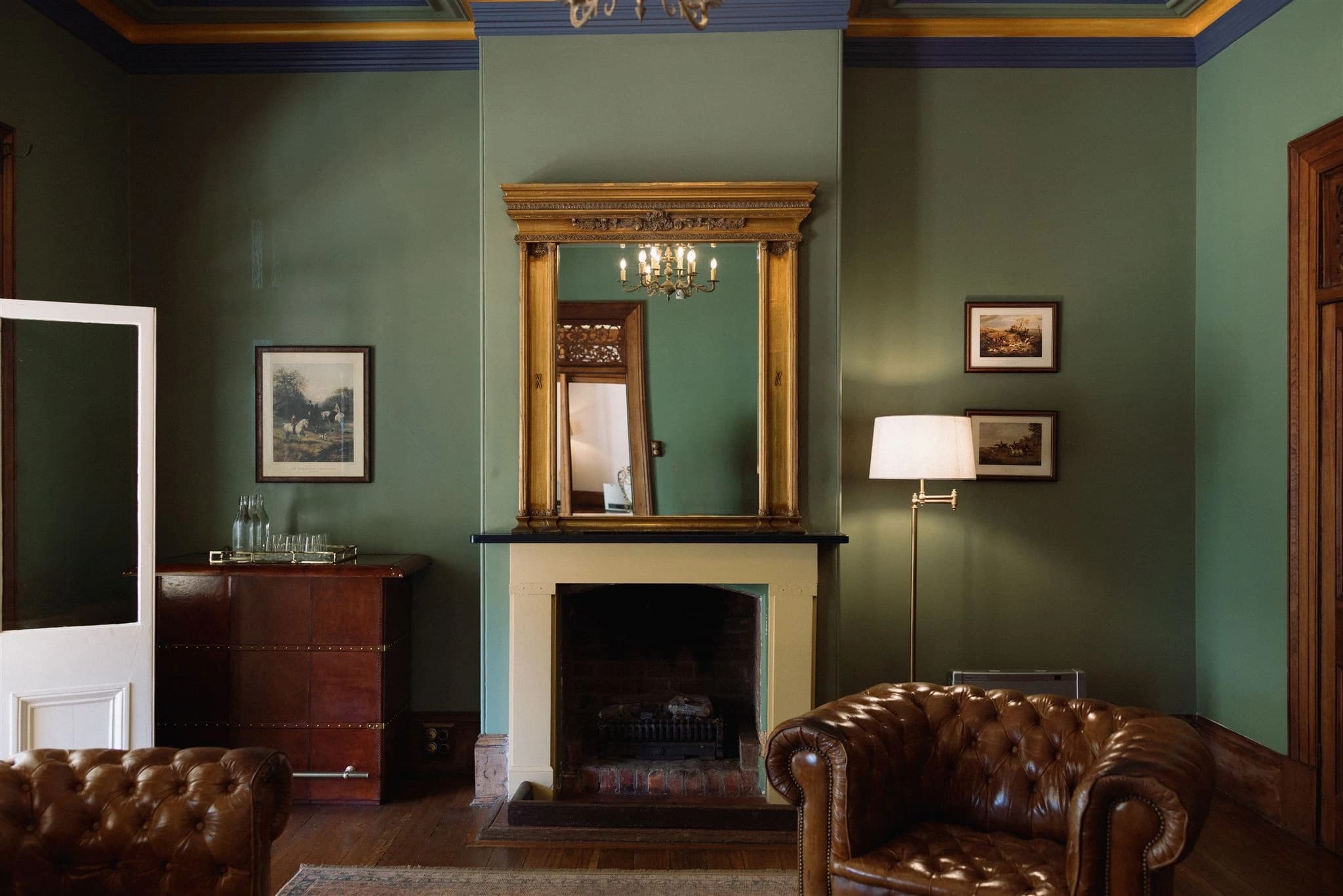 Step into the elegance of the library at Gabbinbar, nestled within the heart of the homestead, welcoming guests with its restored Chesterfield leather lounges and the gentle crackle of a roaring fireplace.